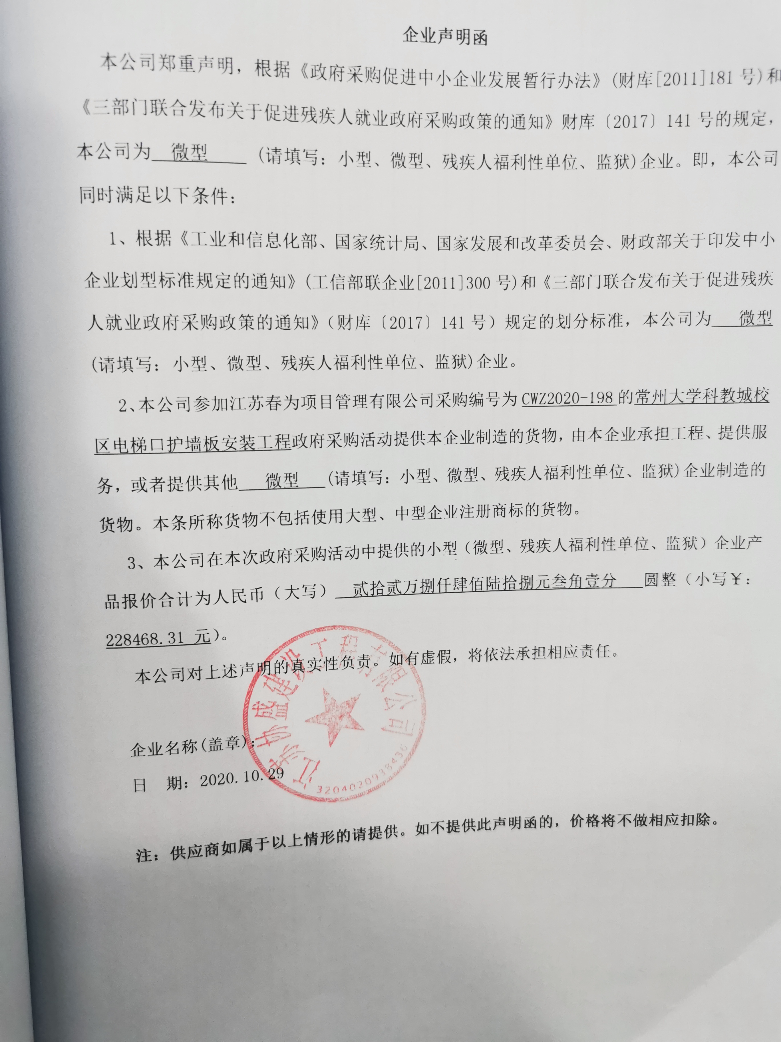 常州大學科教城校區電梯口護墻板安裝工程中標公告